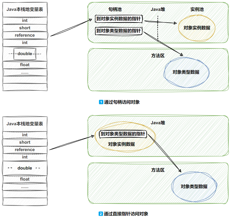- 「句柄访问」:Java 堆中将可能会划分出一块内存来作为句柄池,reference 中存储的就是对象的句柄地址,而句柄中包含了对象实例数据与类型数据各自具体的地址信息