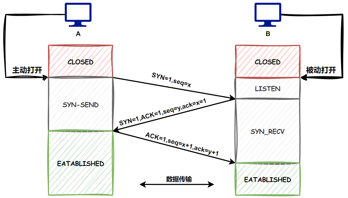 • 第一次握手:客户端向服务端发起建立连接请求,客户端会随机生成一个起始序列号x,客户端向服务端发送的字段中包含标志位SYN=1,序列号seq=x。第一次握手前客户端的状态为CLOSE,第一次握手后客户端的状态为SYN-SENT。此时服务端的状态为LISTEN。
