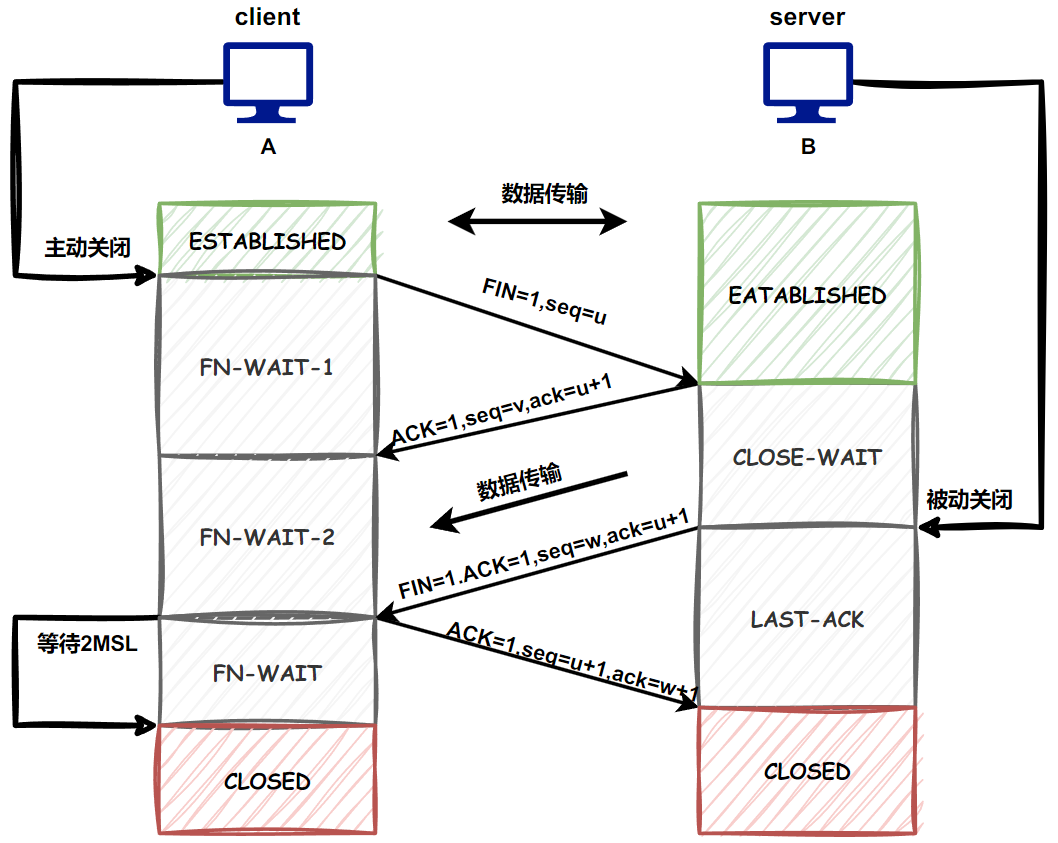 4. B发送完数据,就会发出连接释放报文段(FIN=1,ACK=1,seq=w,ack=u+1),B进入LAST-ACK(最后确认)状态,等待A的确认。