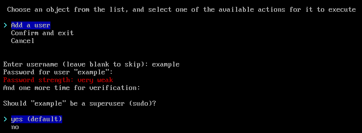 选择add a user,设置用户名密码这些,设置是否为root用户