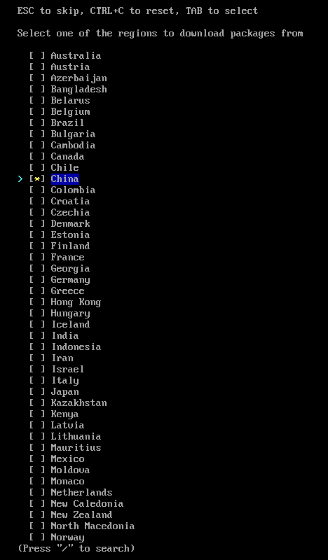 先进入Mirrors,再选中Mirror region后进入,选择China按空格选中,按enter确认返回上一级