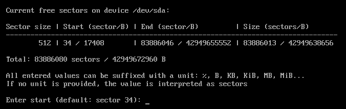​ 之后就是选择扇区,开始在哪,结束在哪,挂载点什么的,这里没有相应的知识储备,可能会看不懂,需要额外学习。